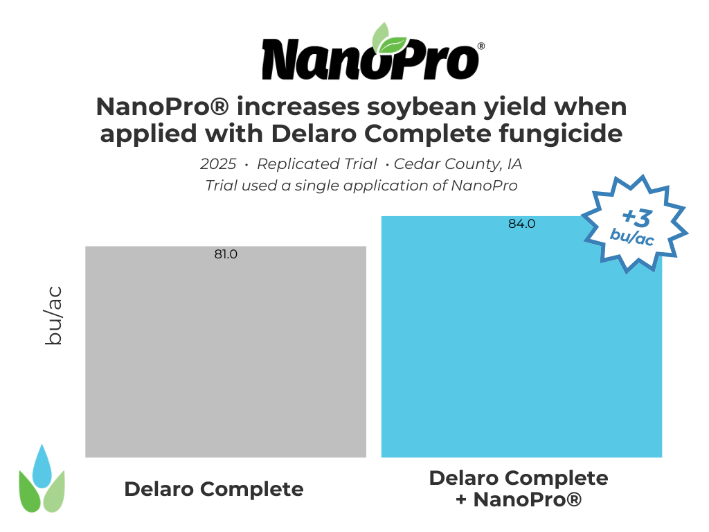 In 2025, a replicated trial in Cedar County, Iowa found that the inclusion of NanoPro with Delaro Complete increased soybean yield 3 bu/acre resulting in a $27.05/acre ROI.