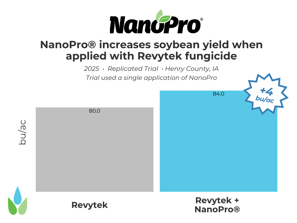 In 2025, a replicated trial in Henry County, Iowa found that the inclusion of NanoPro with Revytek increased soybean yield 4 bu/acre resulting in a $37.40/acre ROI.