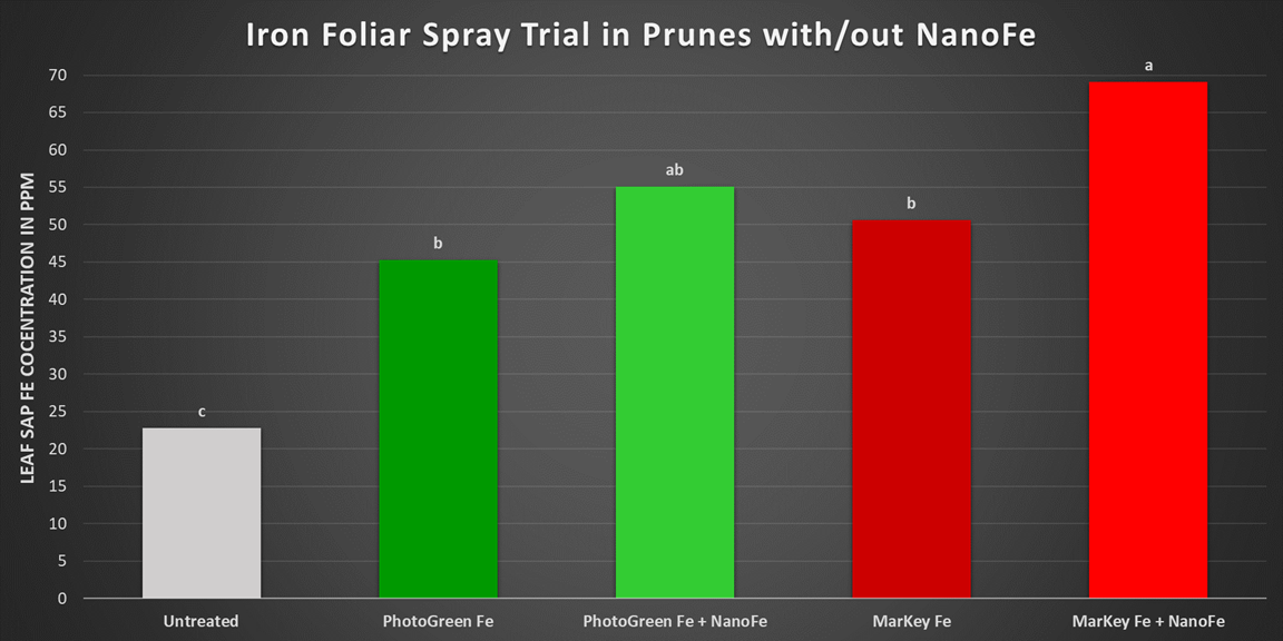 In 2025, a replicated trial in California found that NanoFe increased the uptake of iron in prunes when combined with PhotoGreen Fe and MarKey Fe.