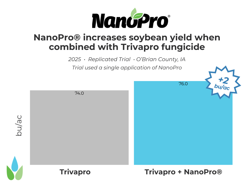 In 2025, a replicated trial in O'Brian County, Iowa found that the inclusion of NanoPro with TrivaPro increased soybean yield 2 bu/acre resulting in a $19.70/acre ROI.