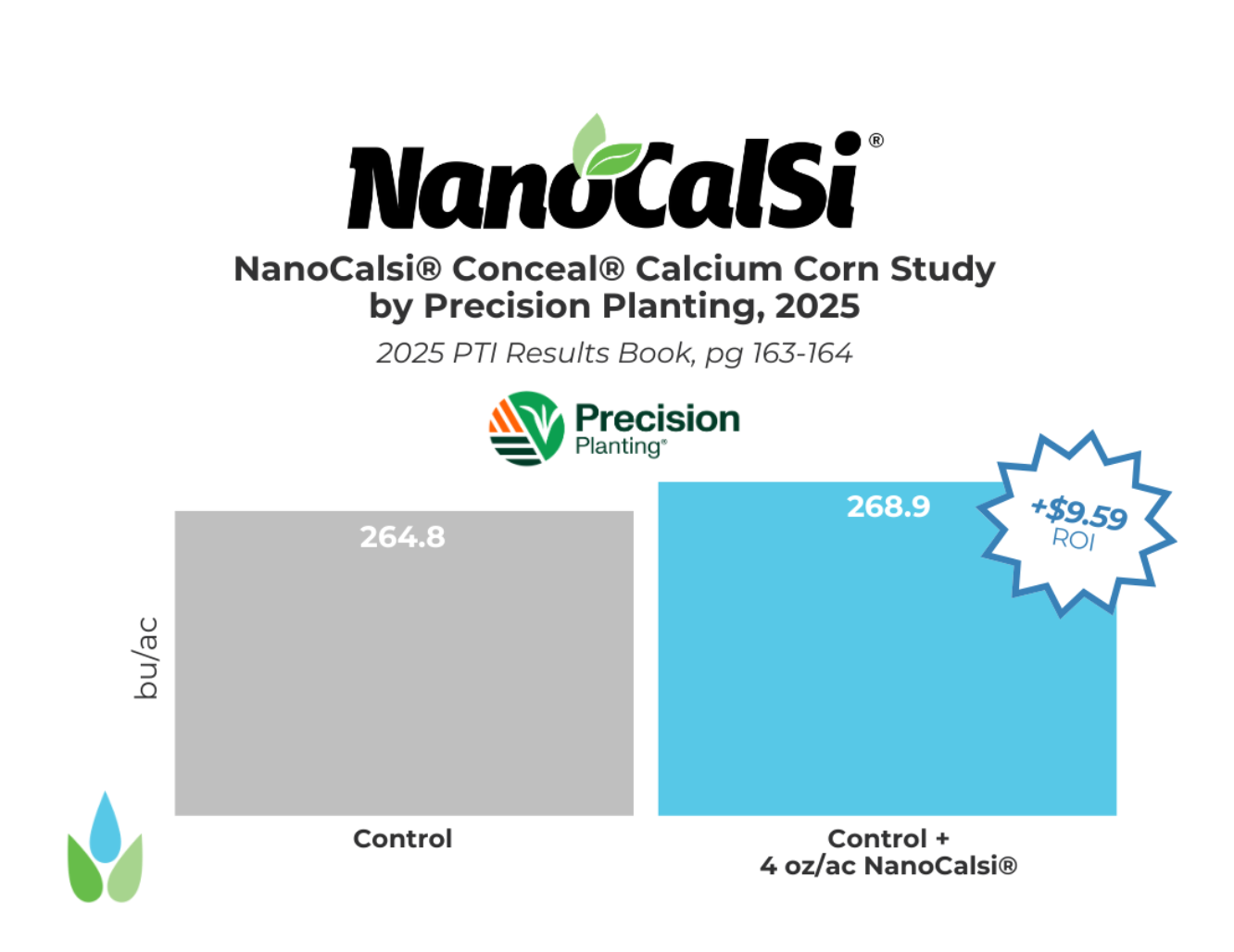 Figure 2. The first year of applying NanoCalSi® resulted in yield advantages of +4.1 bu/ac. NanoCalSi® resulted in a positive economic gain of +$9.59/ac compared to the control.