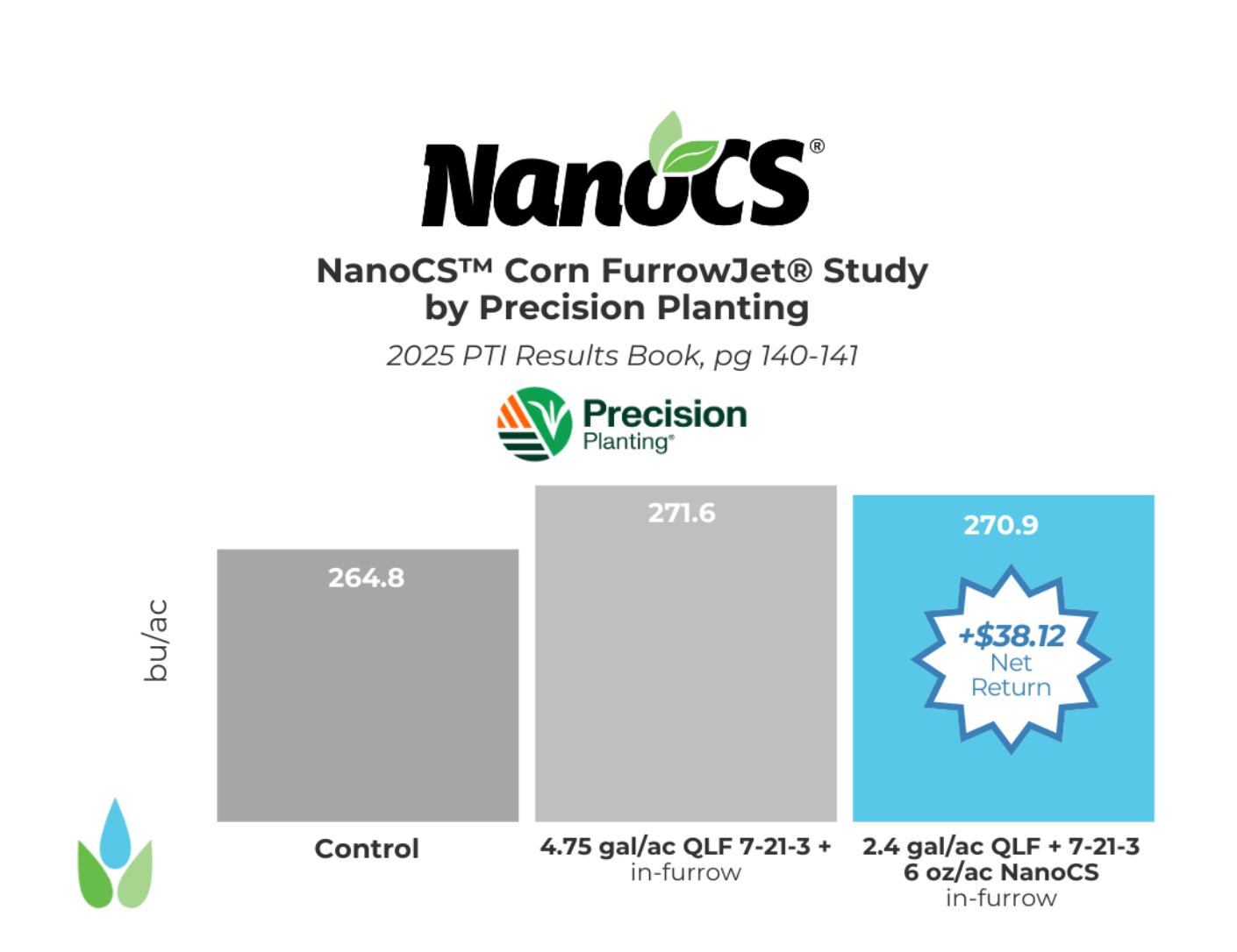 Figure 4. 2025 was the PTI Farm’s 5th year testing NanoCS®. In 2021, NanoCS® resulted in +0.3 bu/ac yield gains with corresponding net revenue gains of +$6.87/ac; in 2022, NanoCS® resulted in +3.3 bu/ac yield gains with corresponding net revenue gains of +$29.20/ac with both years using 10-18-4 in-furrow starter fertilizer. In 2023, we saw yield increases of +8.0 bu/ac along with economic gains of +$13.81/ac with a 6-20-4. Finally in 2025 we saw +6.1 bu/ac along with a net return of $38.12/ac.