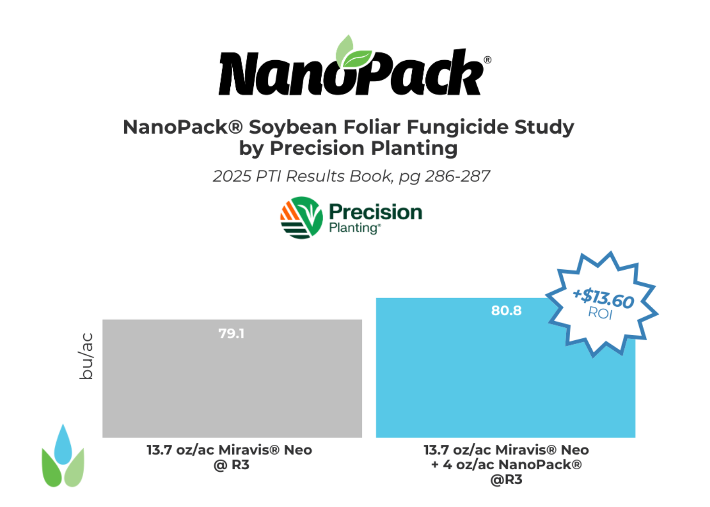 Figure 5. NanoPack™ tank-mixed with fungicide resulted in +1.7 bu/ac yield improvement over the control. Overall economics of the foliar study showed NanoPack™ resulted in economic gains of +$13.60/ac.