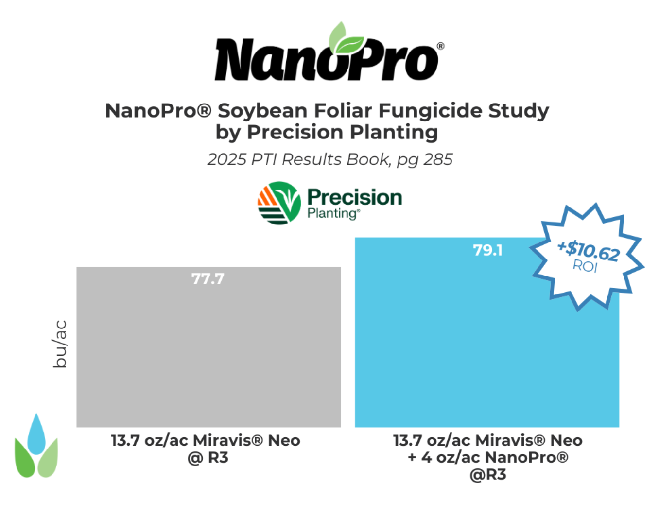 Figure 6. NanoPro® resulted in yield gains of +1.4 bu/ac yield improvement over the control of a standard fungicide application at R3 growth stage, with estimated economic gains of +$10.62/ac.